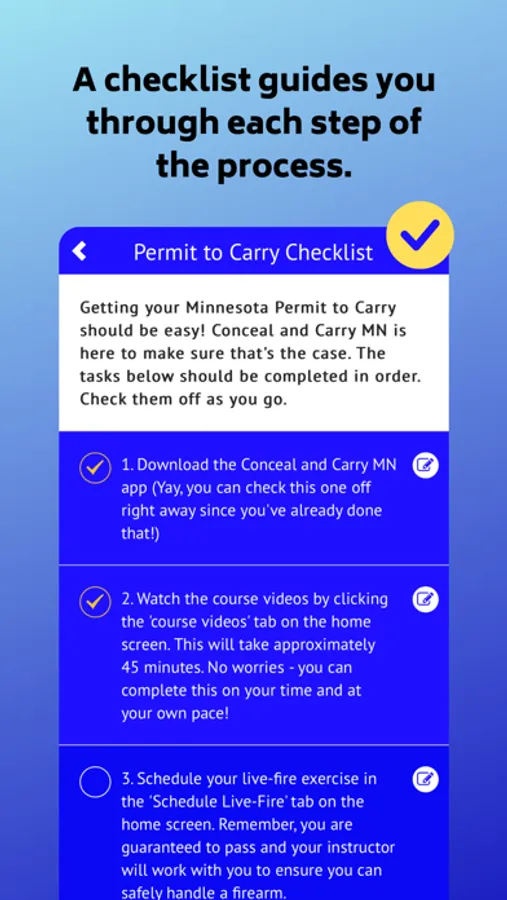 Full access to the app remains even after your permit to carry is obtained, making it a valuable tool to refer to and stay up to date on current state statutes and laws.