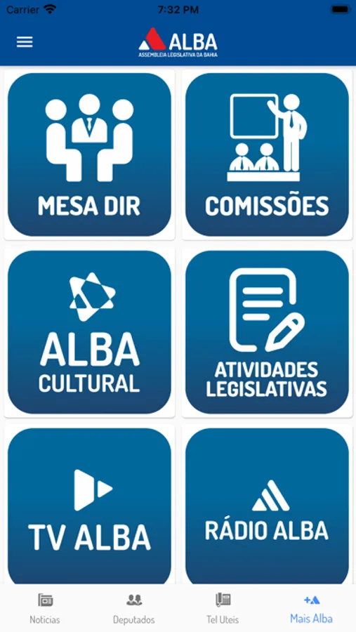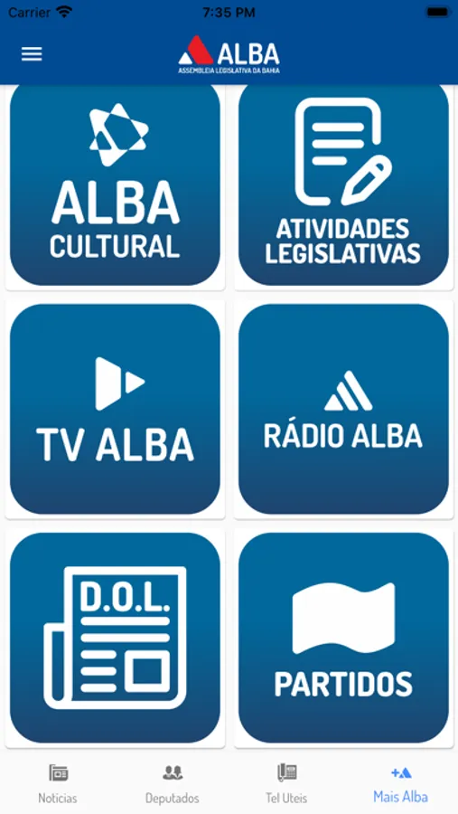 O Aplicativo Alba é o app oficial da Assembleia Legislativa do Estado da Bahia. Com ele você pode acompanhar todas as notícias sobre os principais acontecimentos, o trabalho dos deputados, acompanhar a tramitação das proposições, como Projetos de Leis, Moções, Projetos de Resolução, Decretos Legislativos. Além disto o aplicativo traz uma lista do acervo já publicado pela AlbaCultural. No aplicativo você também poderá acompanhar o trabalho das Comissões Temáticas da Casa, sejam elas, permanentes ou Temporárias. Como plus você terá acesso a lista telefônica dos principais setores da Alba.