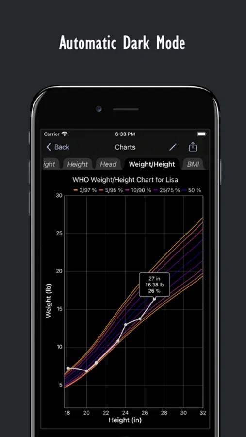 Record multiple children's weight, height, and head circumference measurements and use them to generate growth charts from birth to age 20.