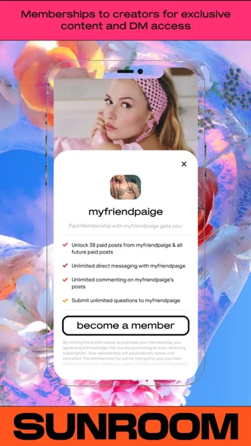 Become a paying member for access to exclusive content from creators, and to DM and comment without having to tip. Earn a Top Member badge by being in the top 1% of a creator's supporters. Grab a Day 1 badge for supporting a creator in their first month on Sunroom, or a Streak badge for interacting with a creator for 5 or more days.