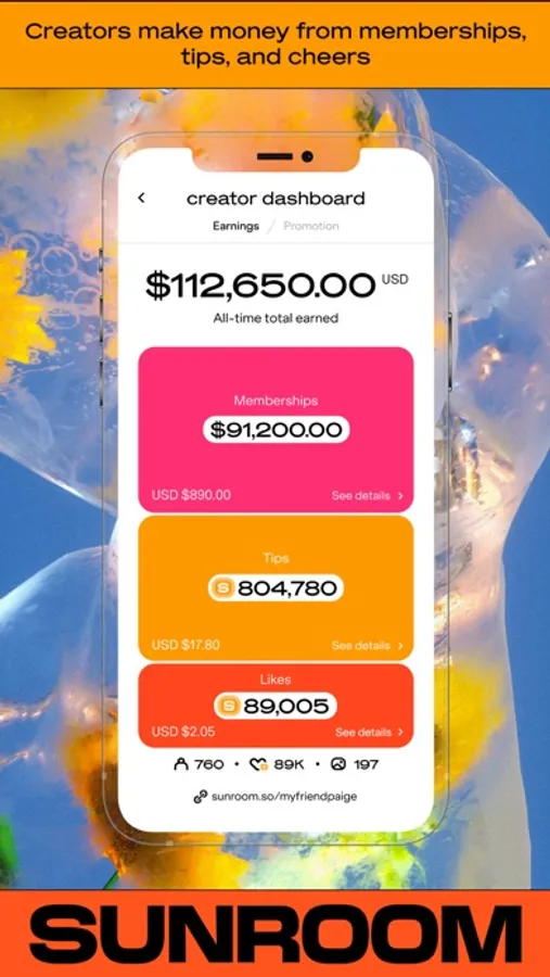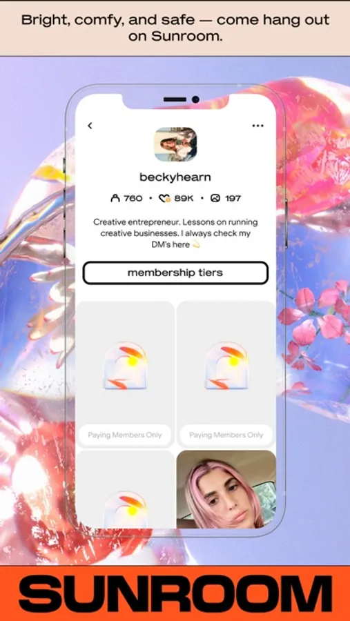 Sunroom is a space that gives women and non-binary creators more control and more freedom. We’re welcoming in a new era of zero-cares woman power, and creating a community around celebrated self-expression. We want our creators to get rich from following their frequency, because making money on your own terms is a form of liberation and we believe there’s no shame in putting a price on your time and content.