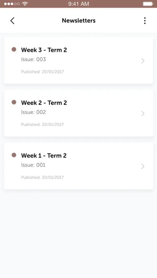 Newsletter: the Newsletter module allows The Killarney School to share electronic newsletters, directly to the app