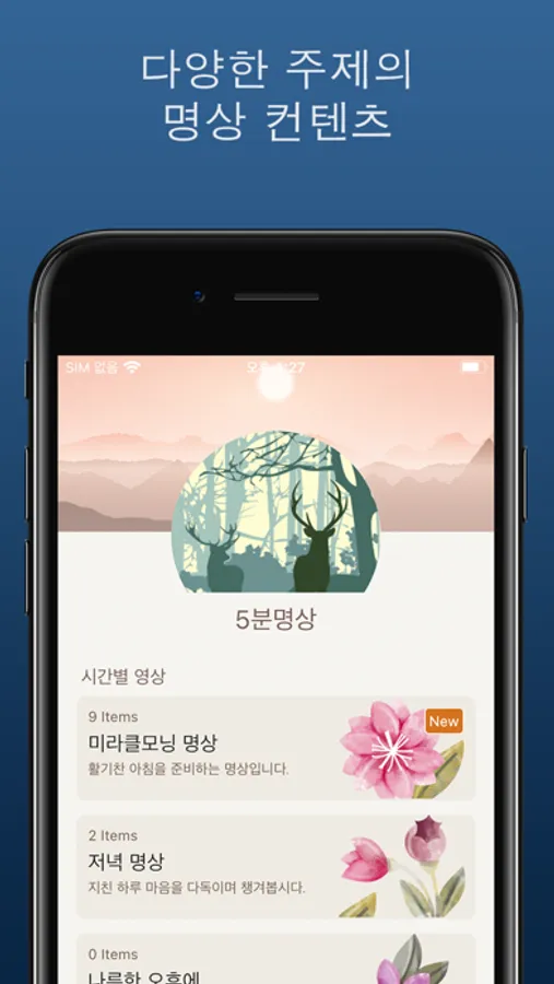 * 5분명상에서는 주제별 명상, 자연과 일상의 소리를 담은 ASMR, 집중과 수면에 도움을 주는 뇌파소리, 스트레스를 풀어주는 점진적 근육이완(PMR) 등 다양한 컨텐츠를 무료로 만나보실 수 있습니다.