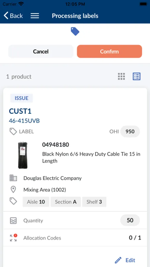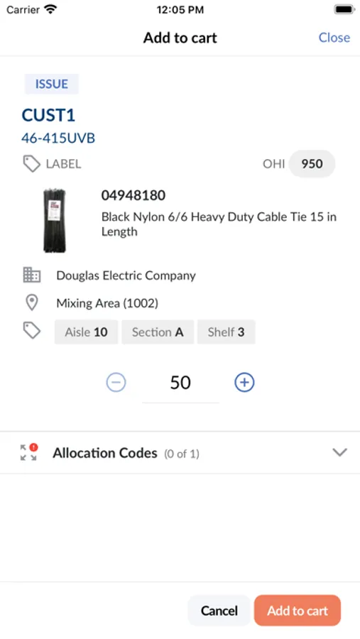 * Issue and Return products to any user defined allocation code like work order, job name, machine name or cost code.