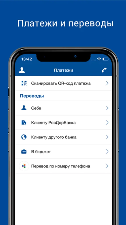 Доступны переводы внутри банка по номеру телефона, номеру карты или счета физического лица, а так же оплату по QR-коду