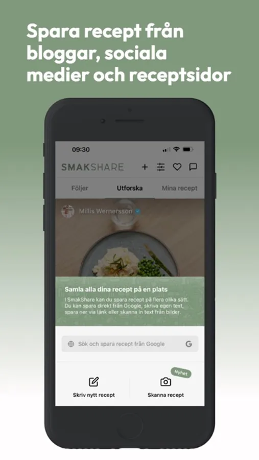 • Spara recept från bloggar, sociala medier och alla kända receptsidor så som Arla, Ica, Tasteline, Mathem, Coop eller Köket.se. Du kan justera receptet efter dina önskemål. Du sparar dina recept privat men kan dela till vänner och familj i appen.