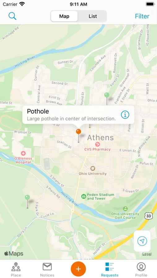 For those potholes, damaged street signs, graffiti, litter, and other local problems that need attention, the Athens City Source app makes reporting a problem easier than ever. This app uses GPS to recognize your location and gives you a menu of common quality-of-life conditions to select from. The app allows you to upload pictures or videos to accompany your request. The mobile app can also be used for a variety of other requests such as street maintenance, street light requests, damaged trees, parking meters, and others. Residents can track the status of reports they or other members of the community have submitted. Residents can also visit our website at https://www.ci.athens.oh.us/Concern to report an issue using the online version of Athens City Source.