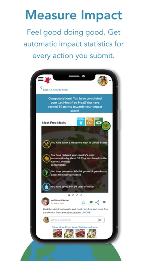 With every action you post on Global Impact, you can automatically measure your unique change in the world with immediate impact statistics. All actions are captured to calculate impact outcomes through carefully curated data algorithms enabling our community to measure individual as well as global progress for sustainable development.