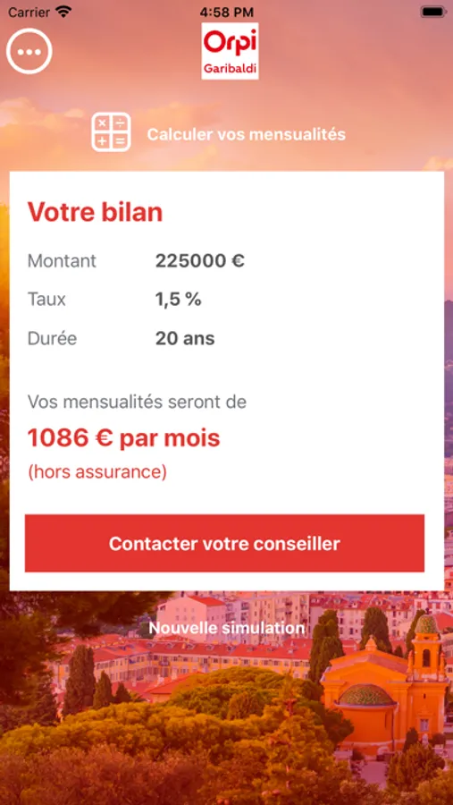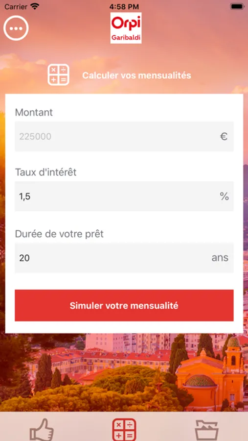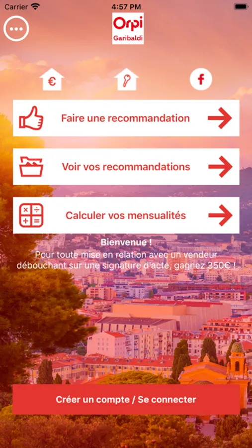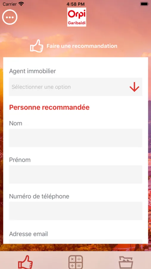 Grâce à l'application Orpi Garibaldi vous allez à la fois pouvoir faire une recommandation d'un ami, voisin, famille, etc à l'agent immobilier de votre choix, mais également pouvoir calculer vos mensualités de remboursement de votre crédit immobilier.