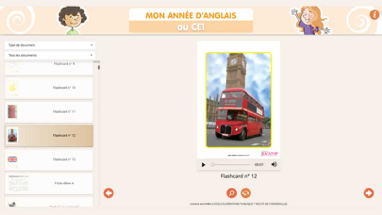 L’application Mon année d’anglais au CE1 disponible sur le Jocastore permet de projeter les flashcards, les cartes ainsi que les fiches élèves et leur corrigé.
