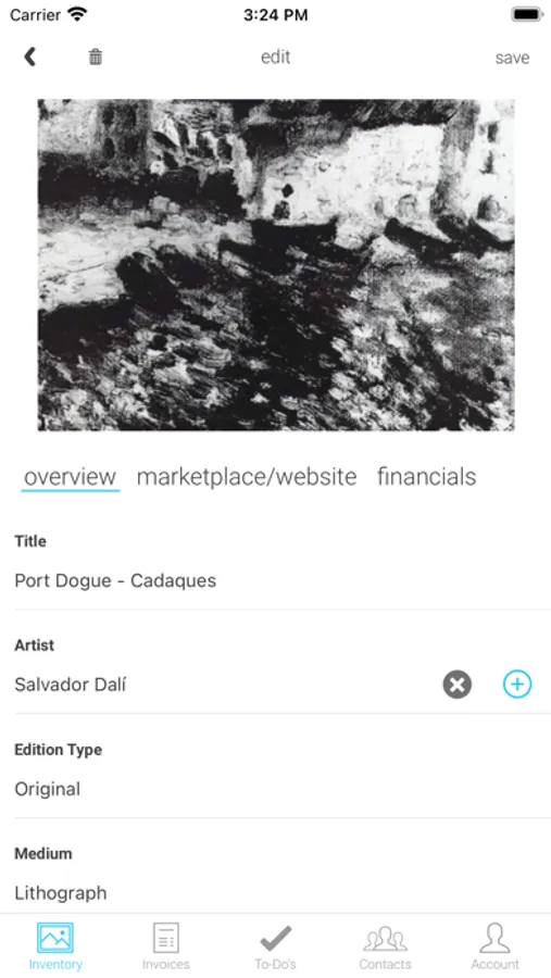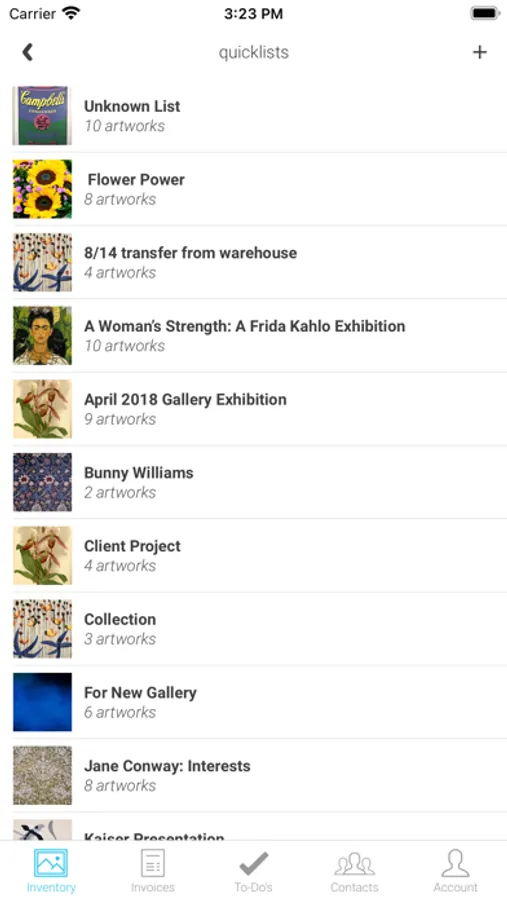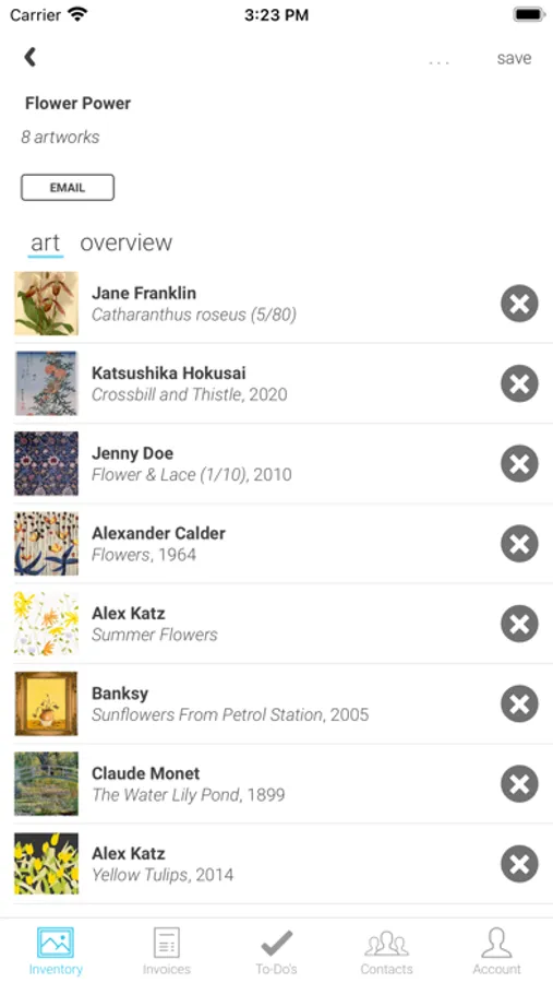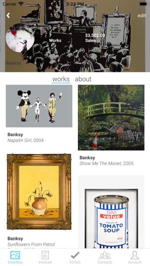 The ArtCloud manager app gives you access to your ArtCloud Manager account from iPhone and iPad. Quickly and easily edit inventory, email tear sheets, and create invoices from anywhere.