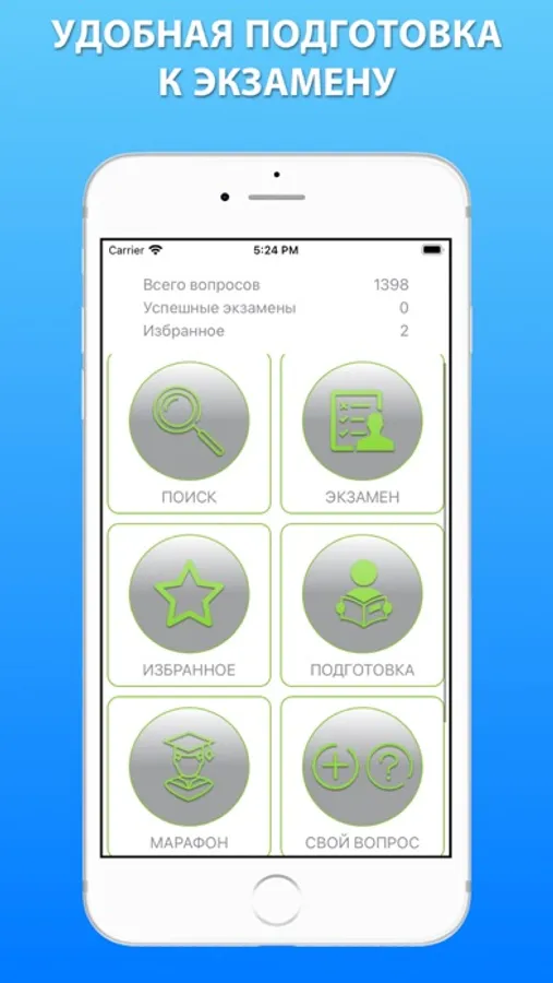 • Подготовка - Позволяет изучить вопросы в текстовом формате с отмеченными правильными ответами;