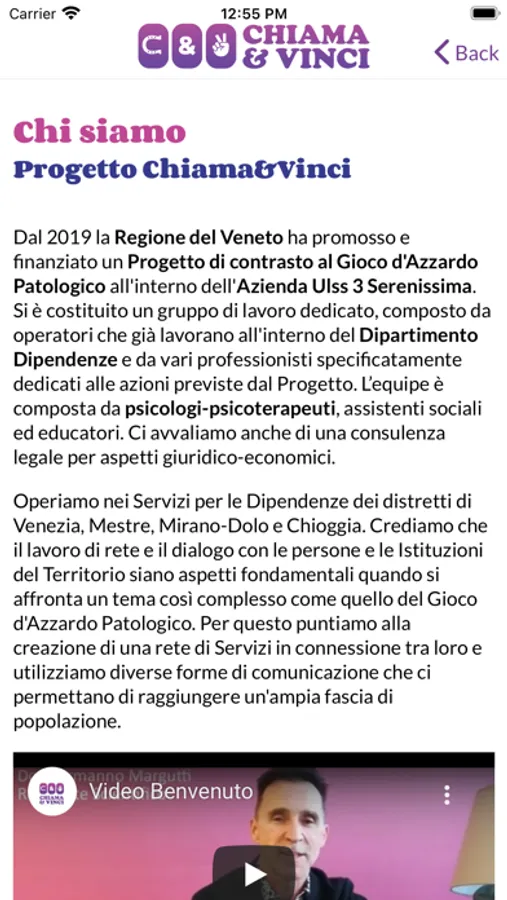 Il team è un gruppo di professionisti impegnati in azioni concrete rivolte alle persone che entrano in contatto con il gioco d'azzardo e le loro famiglie. Promuoviamo attraverso l'App la prevenzione e la sensibilizzazione con percorsi di supporto e di cura, favorendo il benessere personale ed il rafforzamento delle life skills. Siamo presenti nei Comuni dell'Azienda Ulss 3 Serenissima contribuendo a diffondere una cultura dell'informazione, dell'educazione e la creazione di reti virtuose a servizio di tutta la comunità.