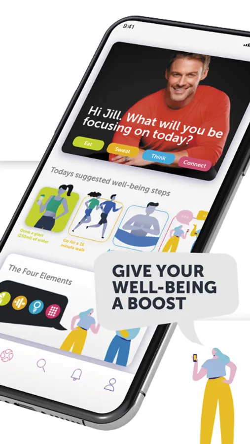 The app gives you an always-on conversation that asks how are you feeling, what are you in the mood for, and where might you need help. You can explore Eat, Sweat, Think and Connect in a way that works for you, checking in for a quick hit or going deeper and exploring your well-being.