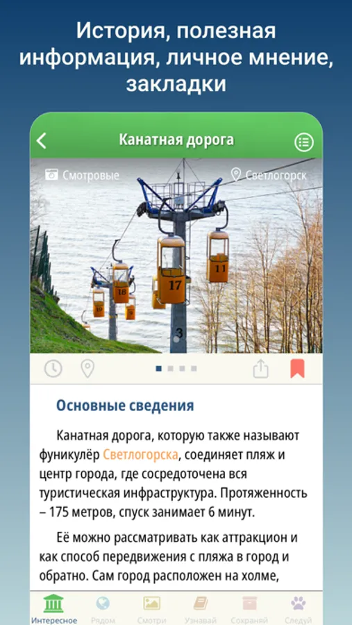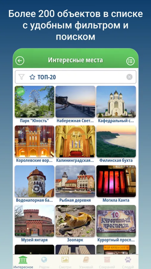 - ИНТЕРЕСНОЕ. Список достопримечательностей, который удобно фильтруется по городу и типу места. Каждая достопримечательность – это отдельная карточка. Помимо цен и режима работы, можно почитать историческую справку, узнать живое мнение от посещения объекта, и добавить его в закладки.