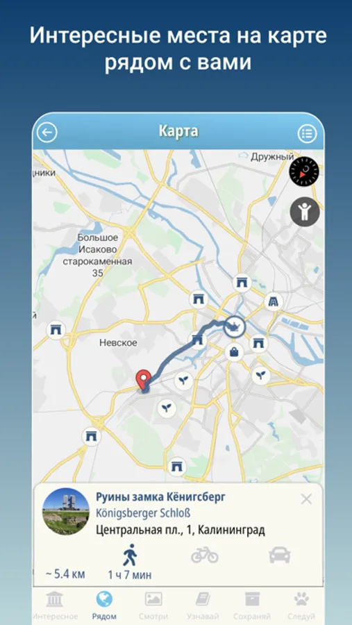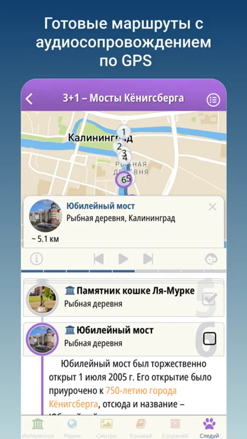 - СЛЕДУЙ. Здесь живут интересные маршруты с голосовым сопровождением. Подсказки включаются автоматически по GPS: достаточно только прийти на начало маршрута и начать по нему двигаться.