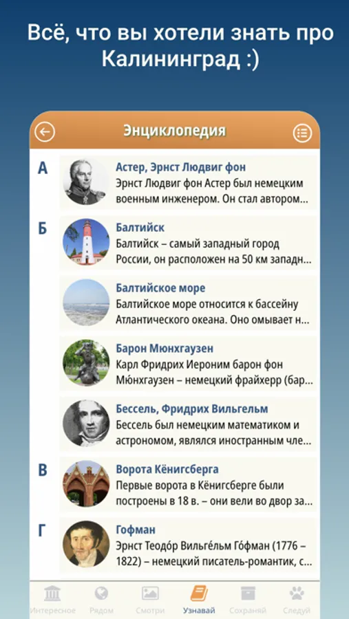 - УЗНАВАЙ. Здесь собраны понятия, люди, старые города и другие сведения, которые имеют отношение к Калининграду. В описаниях достопримечательностей вам будут встречаться ссылки оранжевого цвета – знайте, они тоже приведут вас в энциклопедию.