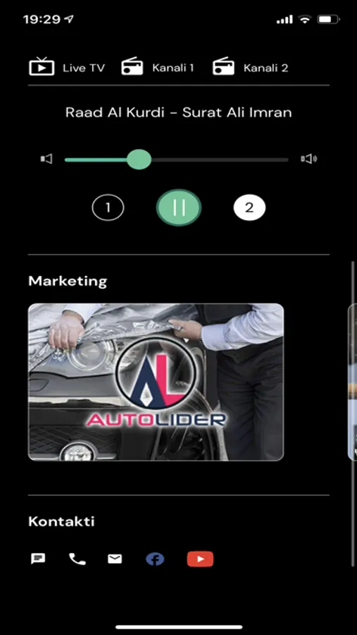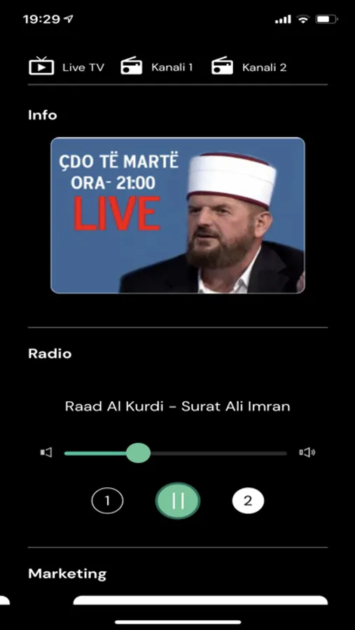 Në këtë aplikacion ju mund të dëgjoni Kanalin 1 i cili transmeton programe të ndryshme edukative dhe fetare, Kanalin 2 i cili transmeton 24 orë Kur'an nga lexues të ndryshëm botëror dhe Televizioni Pendimi me programe të ndryshme edukative fetare dhe emisione të drejtpërdrejta.