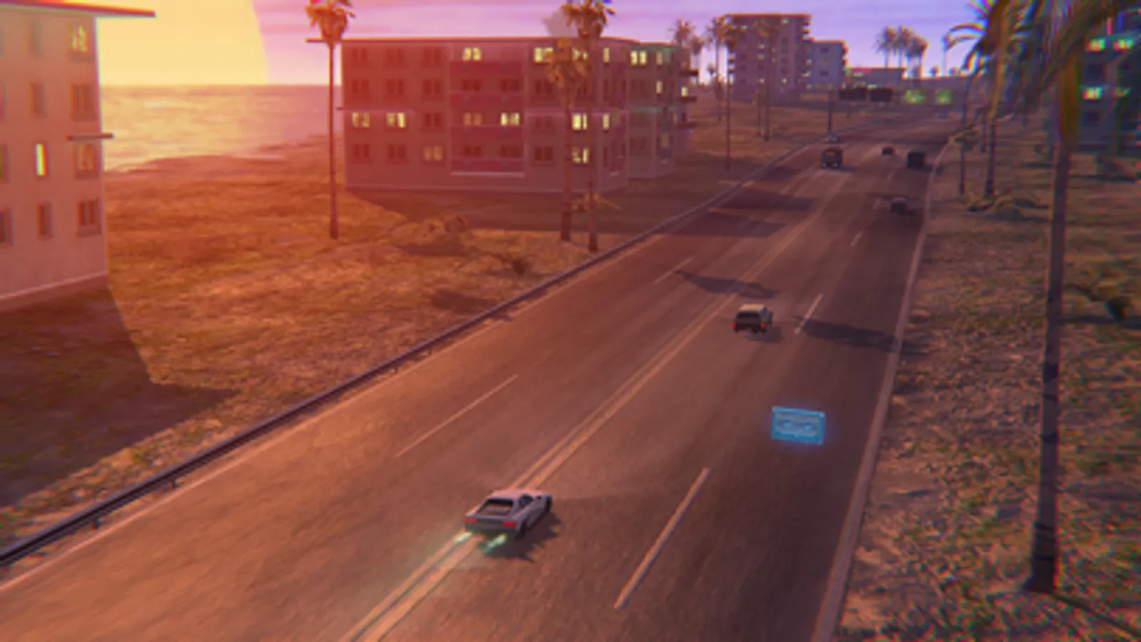 Welcome to FLORIDA INTERSTATE '86, a light-weight driving game where the goal is to cruise into the sunset for as long as possible while earning points by collecting cassette tapes and driving dangerously. A dynamic noon-sunset lighting system, a selection of colorful retro-styled sports cars and a synthwave/chillwave soundtrack ensure that every single one of your trips into this '80s fantasy Sunshine State is a unique one.