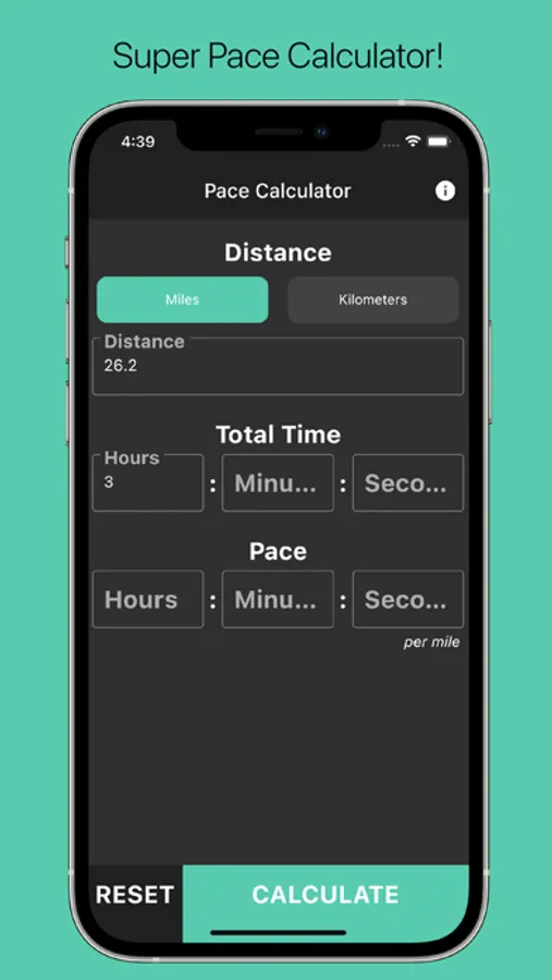 Super Pace Calculator is a 3 in 1 calculator to help make our race preparation and/or training easier. Just enter 2 of 3 variables (Distance, Total Time, Pace) and Super Pace Calculator will crunch the numbers to find the other one out for you! Beautiful and intuitive user interface - way easier to use than the other online calculators!