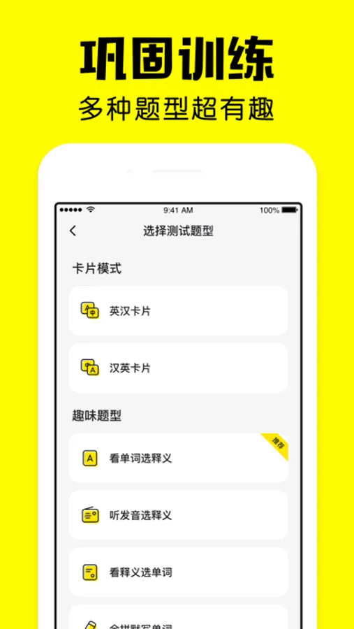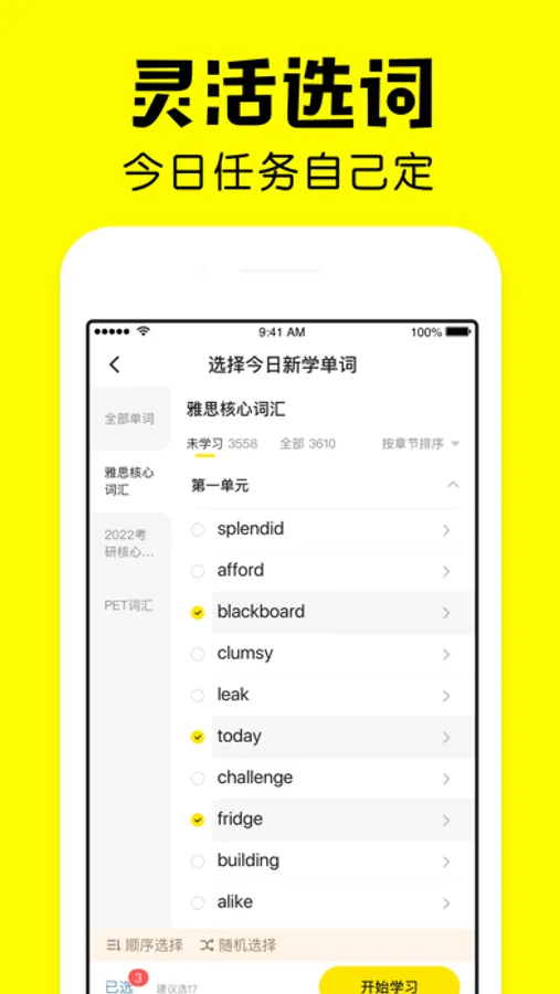 你可以根据系统推荐的单词进行学习,也可以自主选择学习范围