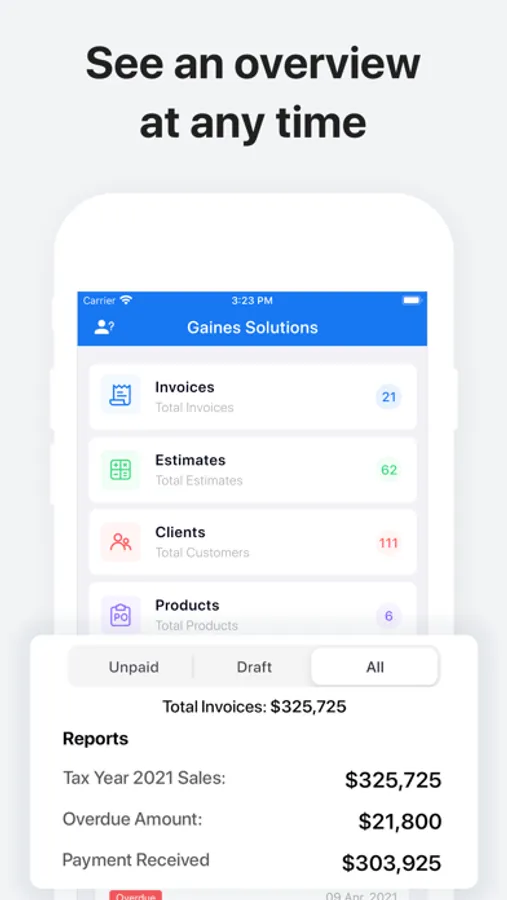Track invoices by customer, category or payment status and access reports and payment records all within the app.