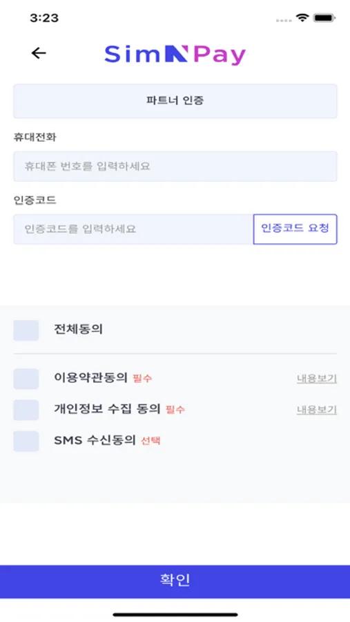 어플 설치 후 휴대폰번호 자동인증에 대한 팝업 창이 뜰 경우, 동의해 주셔야 판매점 인증 또는 일반 고객으로 인증되어 simnpay 어플을 이용하실 수 있습니다.