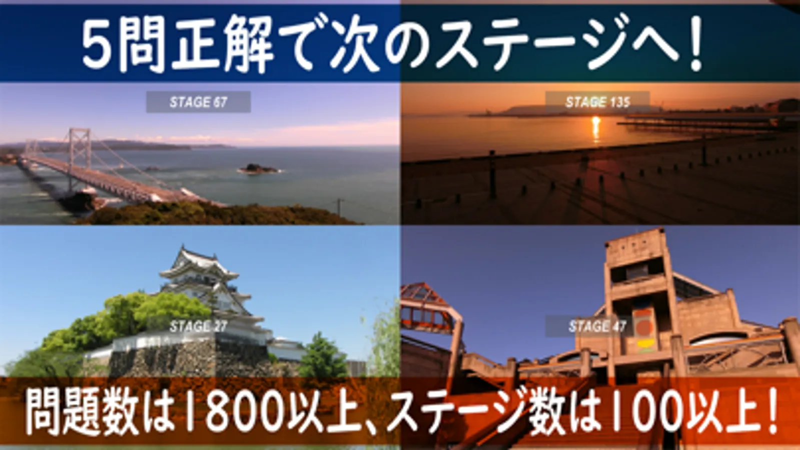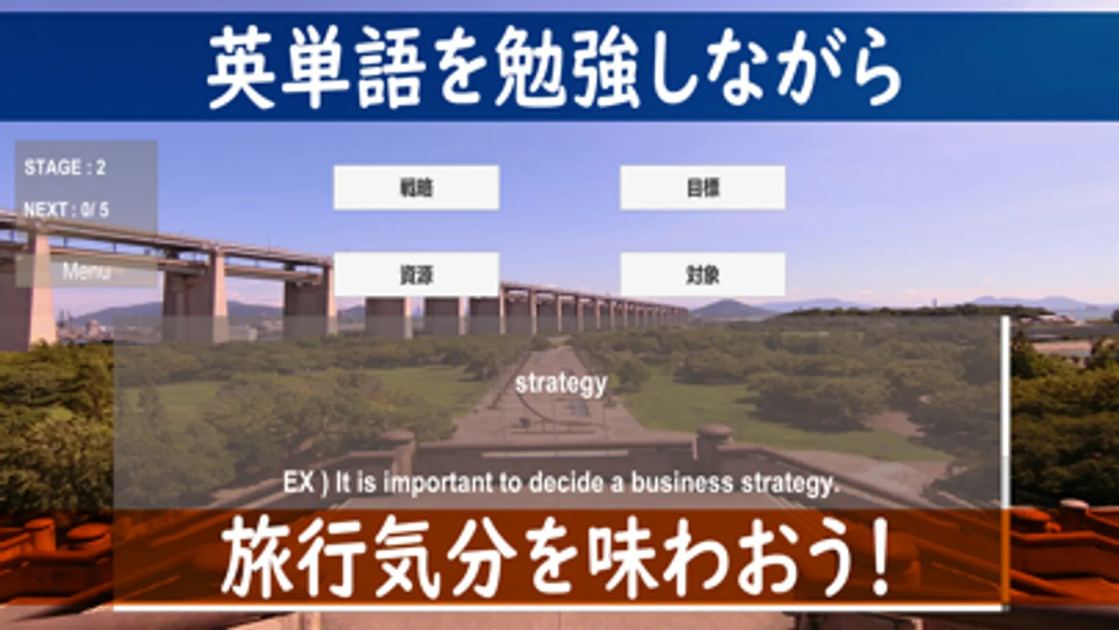 英単語の勉強をしながら旅行気分が味わえるアプリです。英単語の4択問題を5問正解で次のステージに進めます。