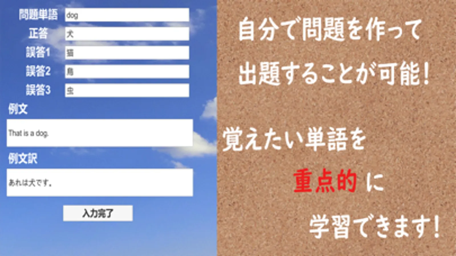 ・自分で問題を作成して出題することもできます。覚えたい単語を重点的に学習できます。英単語以外にも他の学習用にあらゆる4択問題を作成できます。