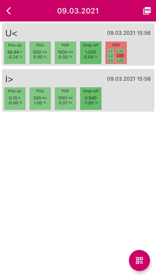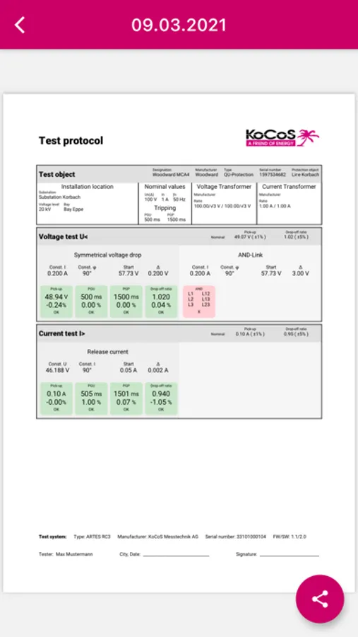 The transmitted results are processed by the app and can then be linked with test object data and summarized in a PDF test report.