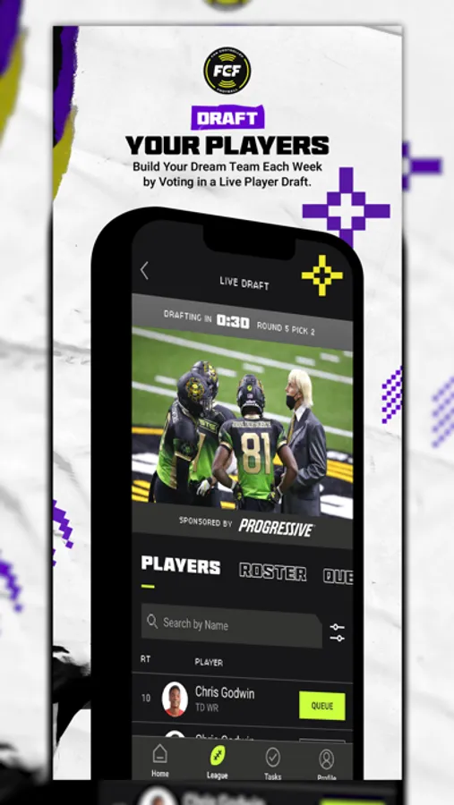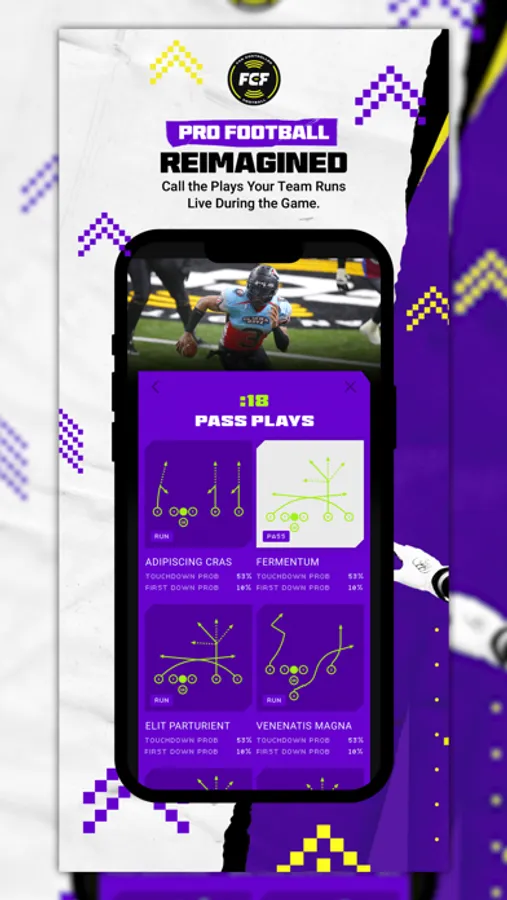 FCF is football re-imagined for the modern digital world where the fans are in charge. Real players compete in a single, high tech studio venue and fans control everything from picking their jerseys, to drafting the players to calling the plays and even deciding the challenges on the field.