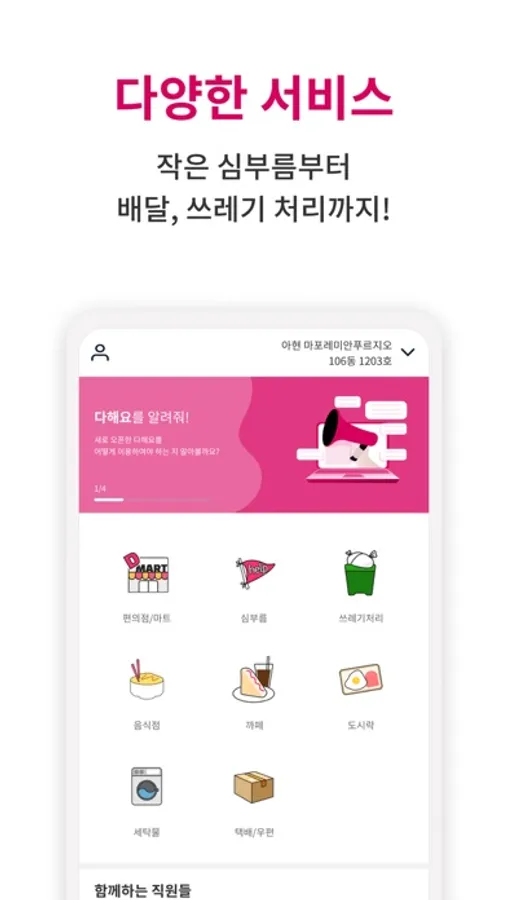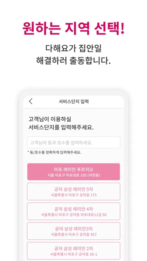 - 마포구의 서비스 지역내의 아파트/오피스텔/오피스 뿐 아니라, 일반 가정까지 동을 중심으로 심부름/배달/마트/중고거래 등 생활편의 서비스를 제공해 드립니다.
