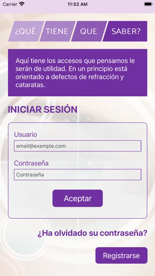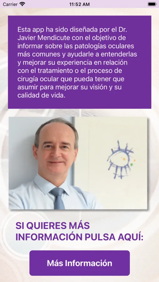 Esta app ha sido diseñada por el Dr. Javier Mendicute con el objetivo de informar sobre las patologías oculares más comunes y ayudarle a entenderlas y mejorar su experiencia en relación con el tratamiento o el proceso de cirugía ocular que pueda tener que asumir para mejorar su visión y su calidad de vida.