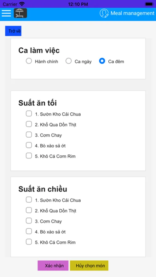 Các tính năng của app: Đăng ký, và chọn món ăn theo ca làm việc. Xem lại lịch sử các món ăn đã chọn.