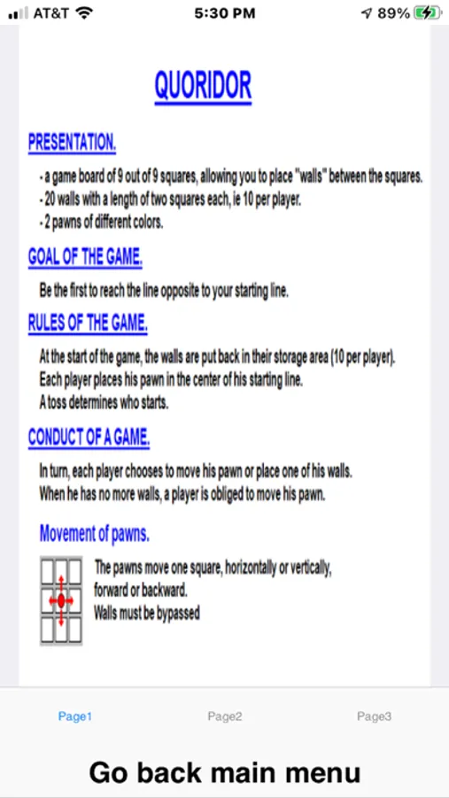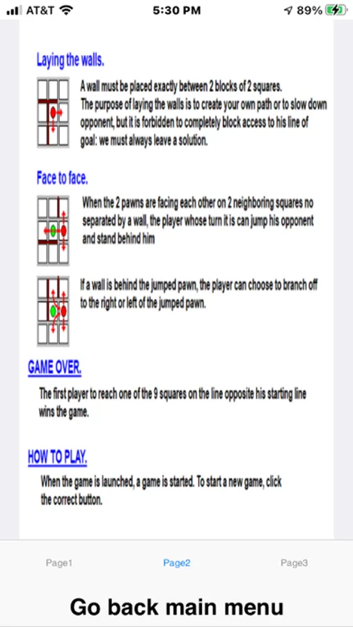Pawns can be moved to any space at a right angle (but not diagonally). If adjacent to another pawn, the pawn may jump over that pawn. If an adjacent pawn has a third pawn or a wall on the other side of it, the player may move to either space that is immediately adjacent (left or right) to the first pawn. Multiple pawns may not be jumped. Walls may not be jumped, including when moving laterally due to a pawn or wall being behind a jumped pawn.