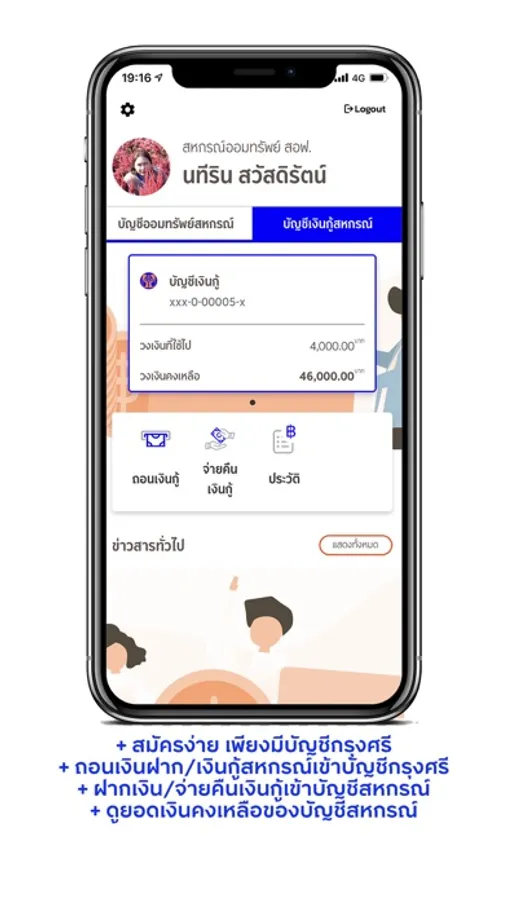 - ทำรายการถอนเงินกู้ จากบัญชีเงินกู้สหกรณ์เข้าบัญชีกรุงศรี