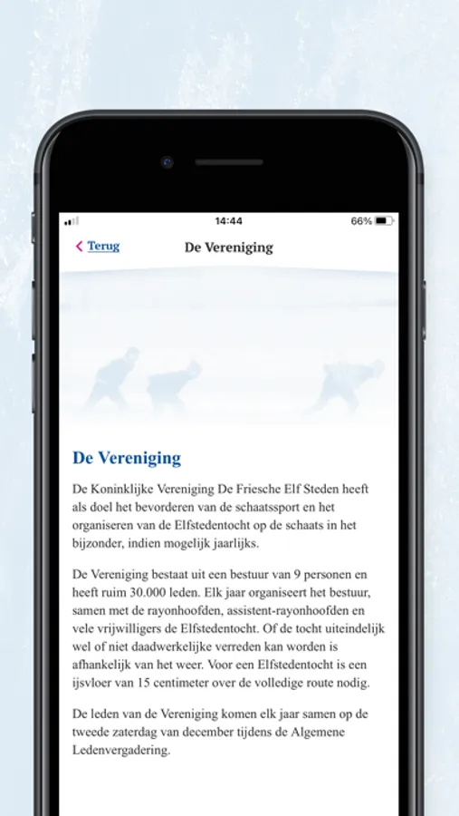 In de app: informatie over deze Tocht der Tochten en ander nieuws vanuit de organiserende Koninklijke Vereniging De Friesche Elf Steden. Zodra het voldoende (lang) vriest en de kans op een Elfstedentocht reëel is, geeft de app ook informatie over een eventuele Elfstedentocht. Tijdens de Elfstedentocht geeft de app de meest actuele informatie zodat deelnemers en toeschouwers goed op de hoogte blijven van recente ontwikkelingen.