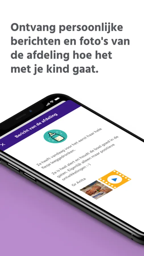 - Vanaf de afdeling ontvang je persoonlijke berichten en foto’s hoe het met je kind gaat op het moment dat je er even niet bij kan zijn. Dat is wel zo geruststellend, bijvoorbeeld als je ’s ochtends wakker wordt. Deze berichten worden opgeslagen in jouw persoonlijke dagboek.