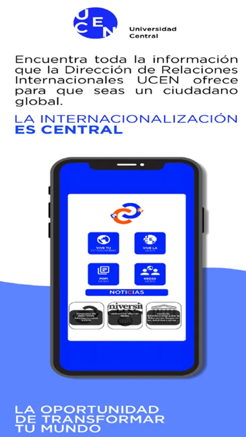 Through this APP, you will have the opportunity to identify all the destination universities, tour our campuses through the map application on your device, learn about the extensive network of international agreements that UCEN has for you, review the scholarship calls available, discover international funding opportunities for the development of academic and research activities, news and all the information you need to become a global citizen.