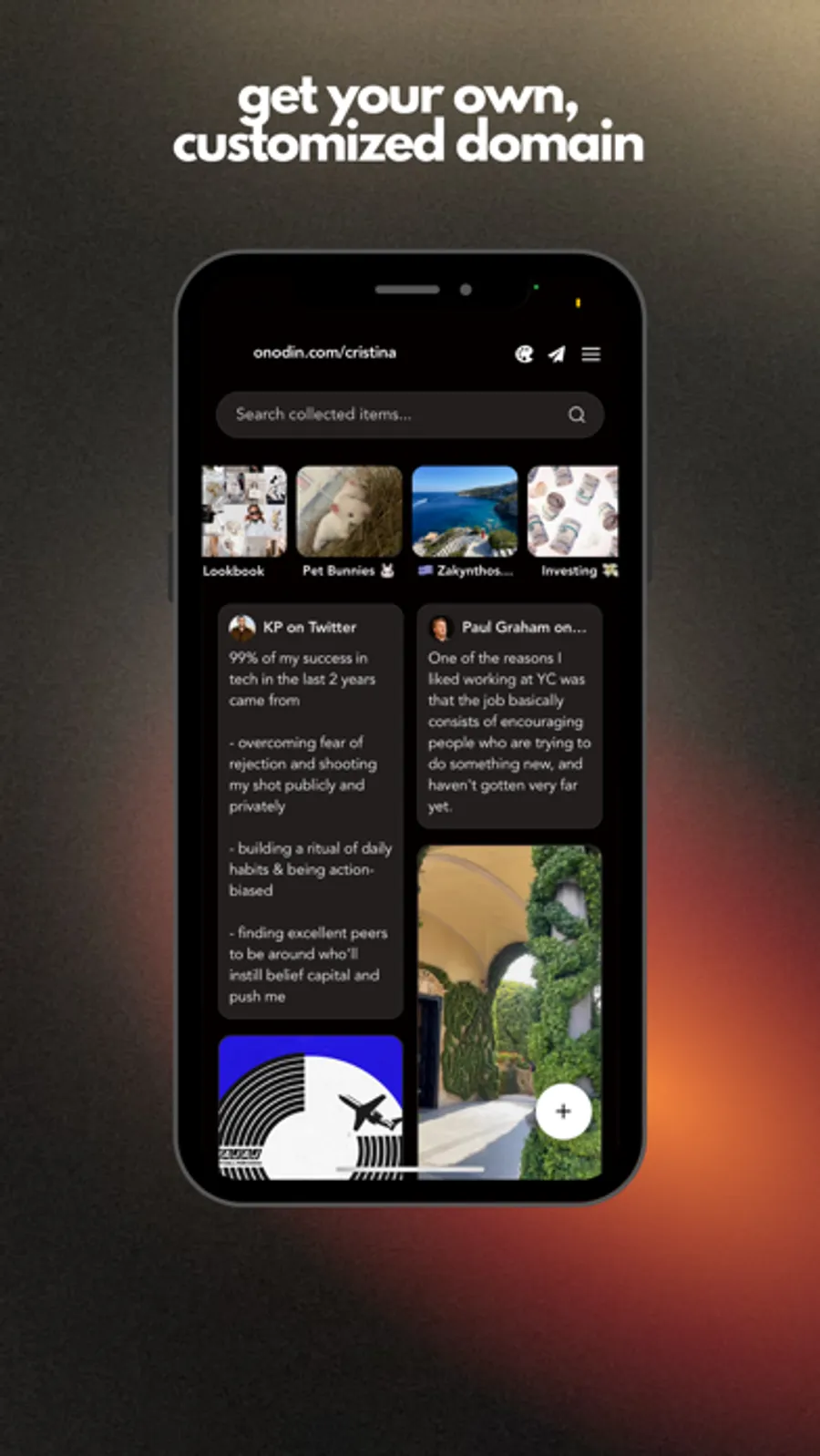 Each Odin user gets their own subdomain. That means that you can find everything you’re saving at yourusername.onodin.com — easy as that. You can put together ideas, thoughts, anything you want and then share it as your own personal website.