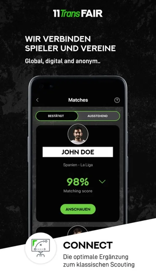 Our software is based on a proprietary algorithm that provides you with an anonymized list of clubs looking for players just like you. Based on an individually calculated 11TransFAIR-matching score (in %) you receive a listing of the matches between your search criteria and the clubs’ request. Gain inside on your market to find the best possible career options for you and “shoot” an offer to express your interest. If the right club shows interest in your profile and also decides on a “shoot”, the anonymity will be lifted. It’s the perfect match! You or your player consultant can then contact the responsible club management directly. Whether it's the Premier League or Bundesliga, Australia or Canada, with 11TransFAIR all doors are open to you - without any cost risk.