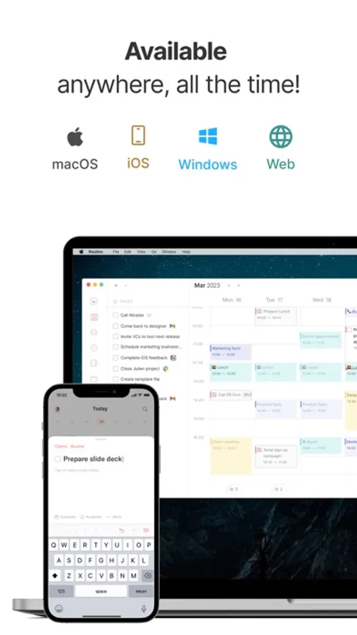 Enjoy unparalleled accessibility with Routine's support for Safari extensions, Siri voice commands, lockscreen widgets, and more. Wherever you are and whatever you're doing, Routine ensures that your calendar and productivity tools are just a tap or voice command away, facilitating seamless integration into your daily life.