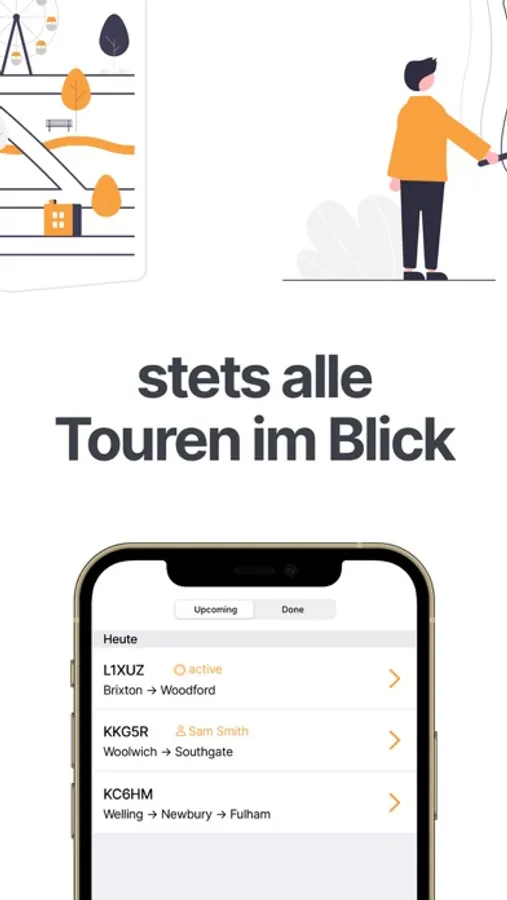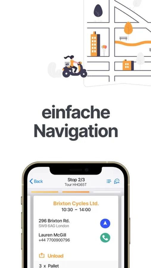 Orbit Cockpit bietet Ihnen eine genaue Navigation über Ihre bevorzugte Navigations-App wie Google Maps, Apple Maps oder Waze. Behalten Sie den Überblick über Ihren Zeitplan mit sekundengenauen Tourinformationen. Erfassen Sie mühelos Liefernachweise (z. B. Fotos, Unterschriften, Dokumente)!