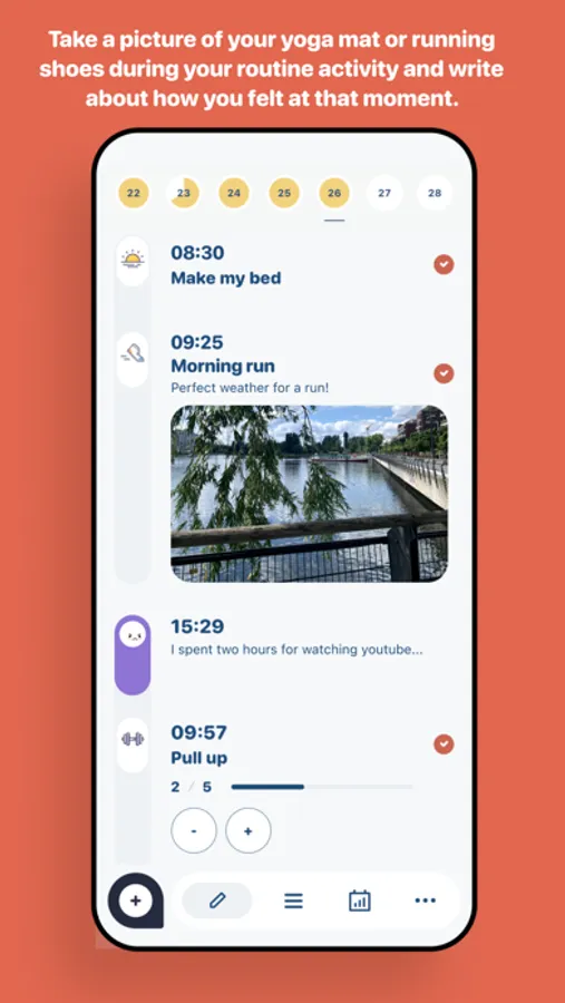Upload pictures of your activities, workouts, or books, and write about how you felt in that moment. Track your daily progress and stay motivated.