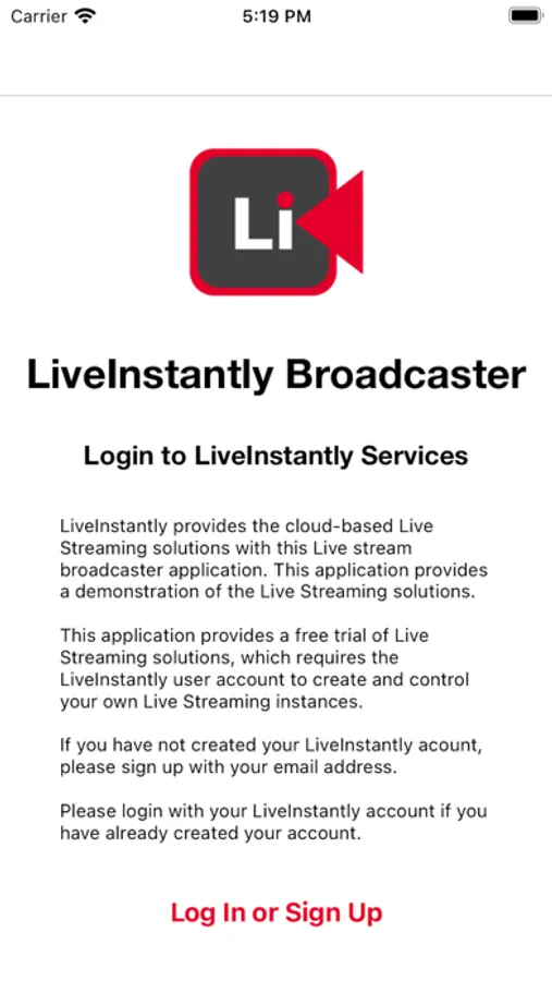 LiveInstantly Broadcaster application provides a live broadcasting function of your captured contents with our cloud-based Live Broadcast services as an example solution, which we, LiveInstantly, LLC., offers to our customers for their production services. Please free free to try this app out as briefing the solution.
