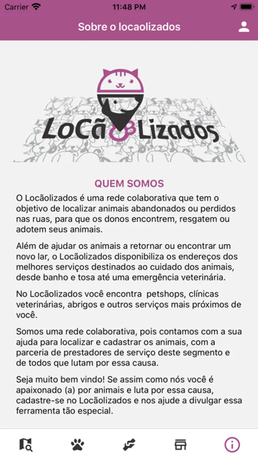 O Locãolizados é uma rede colaborativa que tem o objetivo de localizar animais abandonados ou perdidos nas ruas, para que os donos encontrem, resgatem ou adotem seus animais.