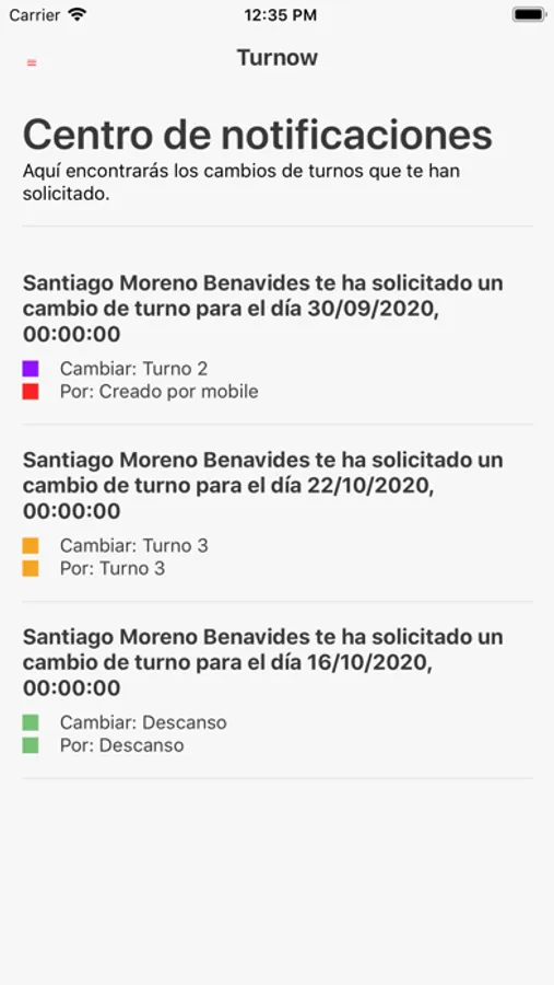 Turnow es la solución efectiva y congruente con las necesidades y los requerimientos actuales para la programación de personal en cuanto a turnos, vacaciones, permisos y demás requerimientos para la programación de personal, todo esto por medio de una multiplataforma que designe automáticamente los turnos asistiendo al administrador o coordinador de esta, enviando notificaciones inmediatamente a los involucrados vendedores, operadores, guardas etc, a su vez estos podrán realizar solicitudes de vacaciones, permisos o notificaciones eventuales.