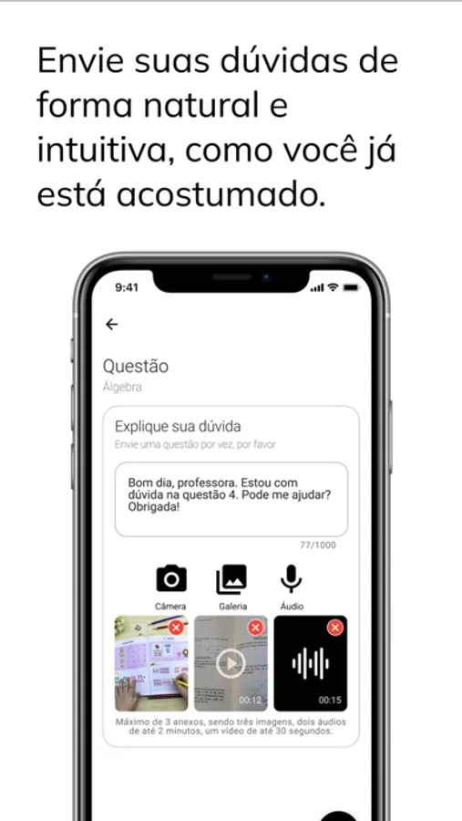Envie suas dúvidas acadêmicas em questões específicas ou conteúdos por meio de texto, vídeos, fotos, áudios e PDFs e receba respostas de professores de todo o país.