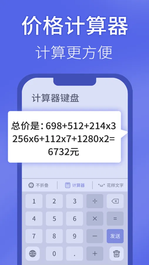 输入法自带微商专用价格计算器。输入各项物品单价和个数,并【清晰呈现价格计算明细与结果】一键发送给客户。