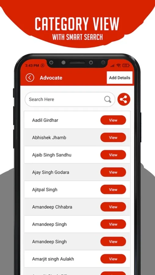On selecting a category, you get a list of persons under that category. Each person also has a view button attached so that the users can view detailed information about that person.